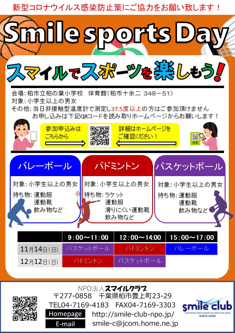 毎月第2日曜日に開催しているスマイルスポーツデイですが、11・12月についても参加者募集中です!!