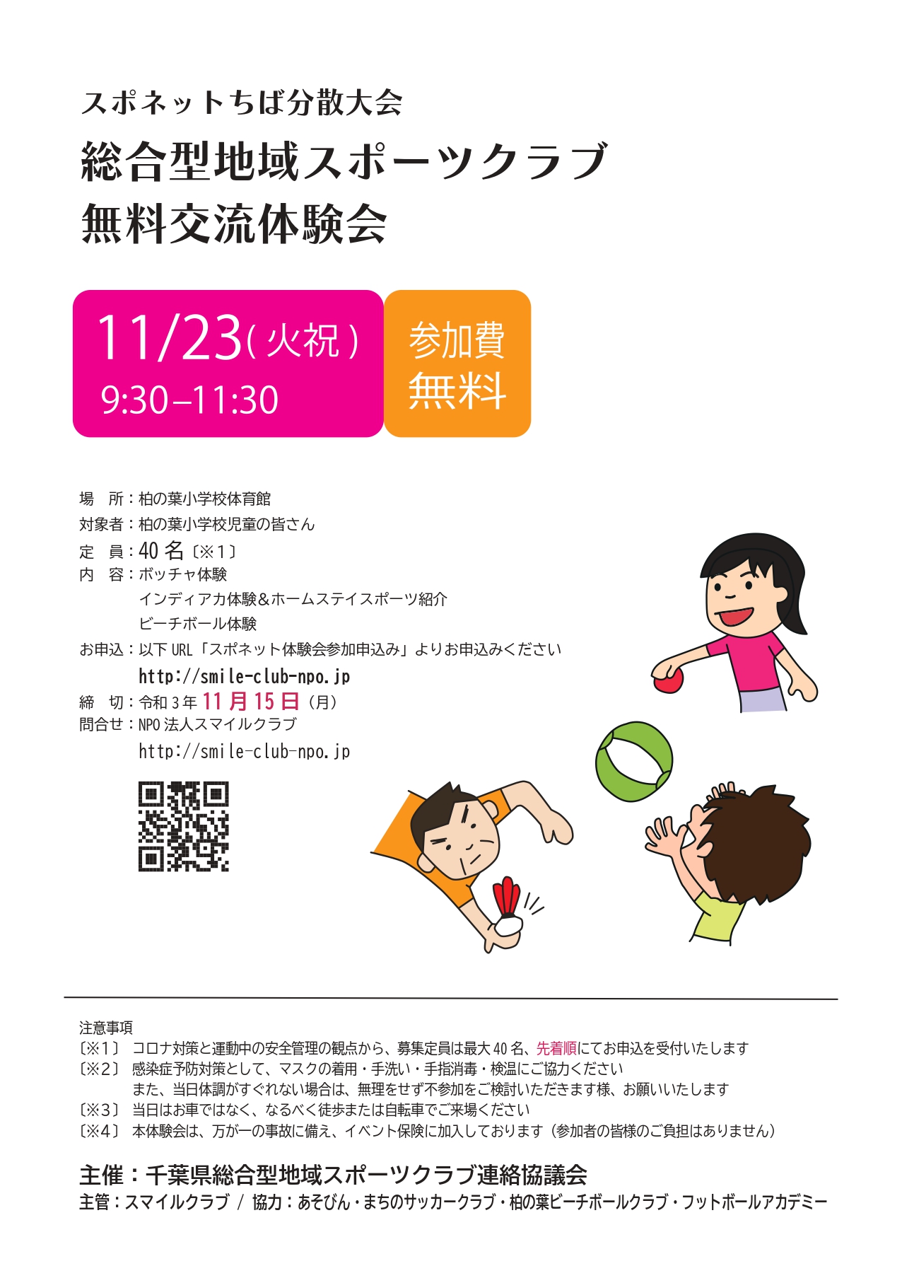 参加者募集NEWS&TOPICS スポネットちば分散大会総合型地域スポーツクラブ無料交流体験会参加者募集!! 参加者募集 2021.11.03 この度千葉県総合型地域スポーツクラブ連絡協議会主催のもとスマイルクラブクラブが主管クラブで総合型地域スポーツクラブ無料交流体験会を11月23日(火祝)柏の葉小体育館で実施致します!! 柏の葉小学校の児童が対象になりますので、参加希望の方は以下のチラシをお読みになって、申込フォームからお申込みください。→申込フォームはこちら
