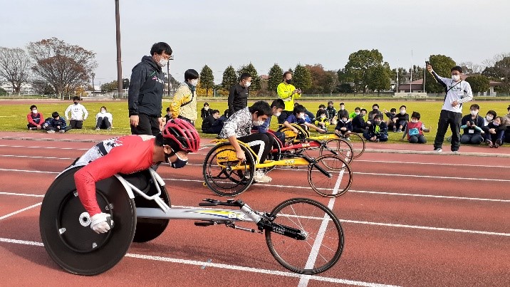 イベント報告スマイルパラアスリートNEWS&TOPICS研究・助成金事業等 パラ陸上体験会開催!(千葉県立栄特別支援学校) イベント報告 2021.11.24 11月19日(金)に千葉県立栄特別支援学校の陸上大会(成田市中台陸上競技場)で、今年の東京パラリンピックに出場した樋口政幸選手を講師に、車いすのパラ陸上体験会(スポーツ庁委託事業)をおこないました。まずは、みんなでレーサーと呼ばれる細長い車いすに乗って走る体験をおこない、そのあとに樋口選手との真剣勝負の競争をおこないましたが樋口選手の圧勝となり、パラリンピック選手のすごさをみんなで実感しました。すごい速さでした!感動! 挨拶中の樋口選手 樋口選手にレーサーに乗って競争