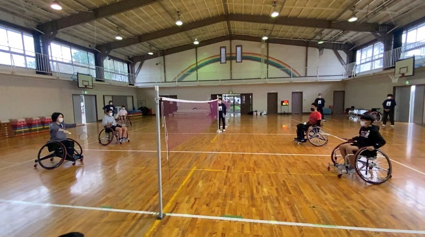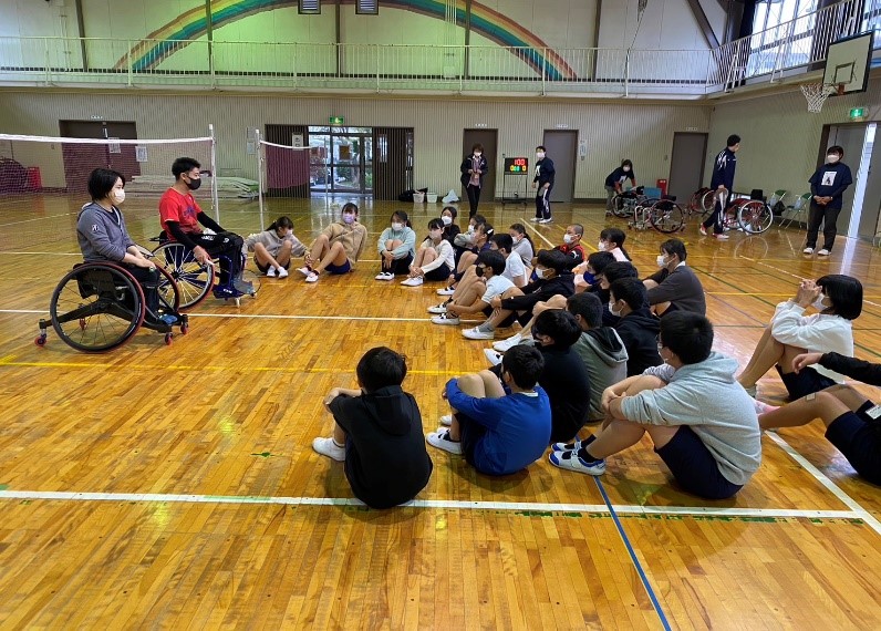 まずパラバドミントン競技についての説明と実演のあと、競技用車いすの乗車体験がありました。そこでは鬼ごっこを行ったり、実際にラケットを持って打ち返す練習をしたりしています。最後には選手と生徒がそれぞれペアを組んで、ダブルスの試合も行いました。選手と生徒のラリーが続くと体育館は大いに盛り上がりました。