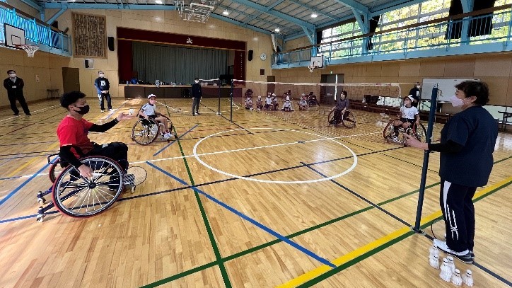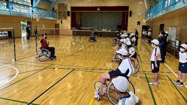 最初に理恵選手と真選手がコートに入り、パラバドミントンのルールやデモンストレーションが行われました。その後実際に車いすに乗り、鬼ごっこやパラバトミントン体験をしてみました。最後には理恵選手、真選手と児童がペアになってのダブルスの試合を3点マッチで行い、児童たちの応援も大いに盛り上がりました。終わった後も「またやりたい」「楽しかった」などの声がありました。校長先生はじめ先生方から「パラスポーツの魅力を体験し、選手とふれあったことが、こどもたちの貴重な学びとなりました。」とお言葉をいただきました。