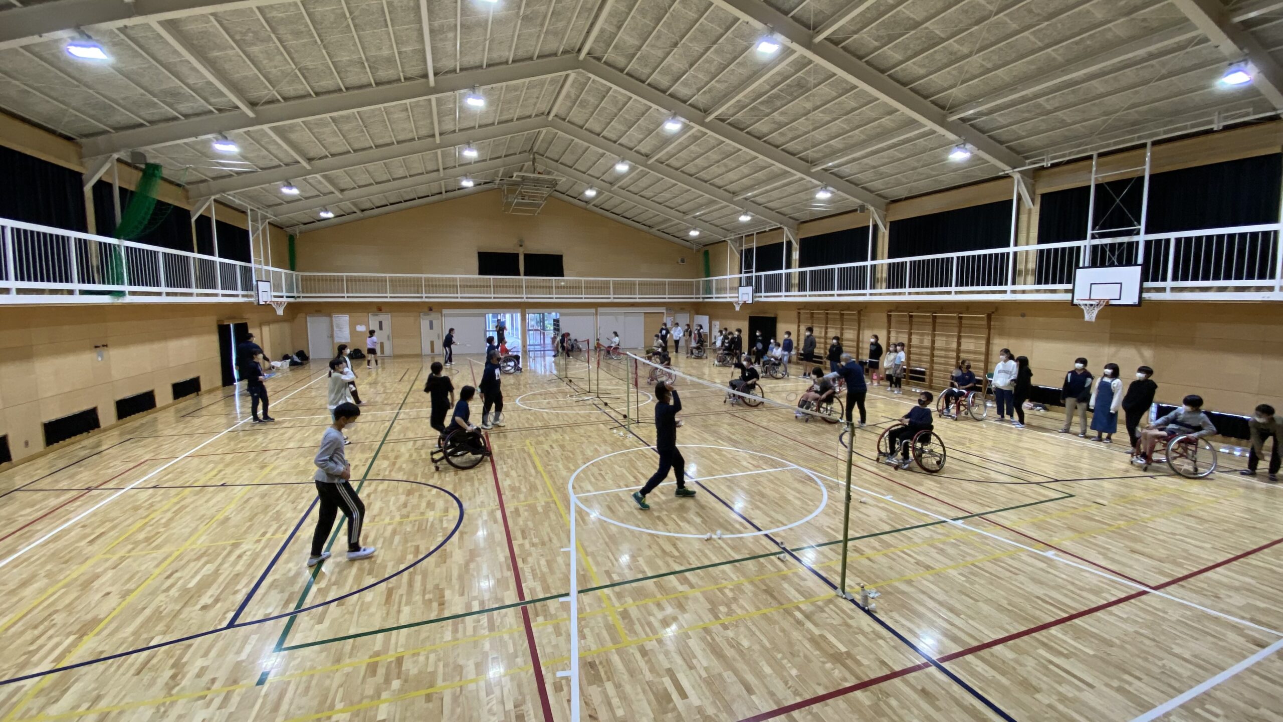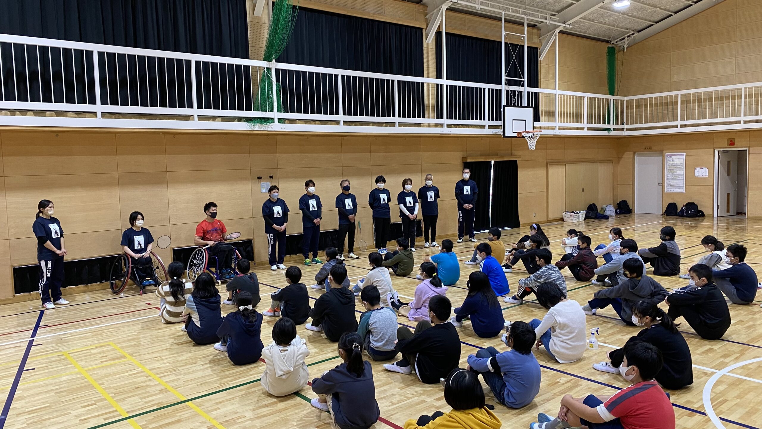 最初に小倉選手と大浜選手による車いすバドミントンのデモンストレーションが行われ、その後実際に車いすに乗って鬼ごっこをしながら競技用車いすの操作体験をしました。次に選手・スタッフと車いすバドミントン体験を行い、車いすを操作しながら打つのに苦労をしていましたがラリーが続くと周りから歓声が上がっていました。選手と児童のダブルスでチームを組んでの試合も行われました。最後に選手への質問の時間ではパラバドミントンについてのことだけでなく、日頃の生活についても児童から質問が出ていました。