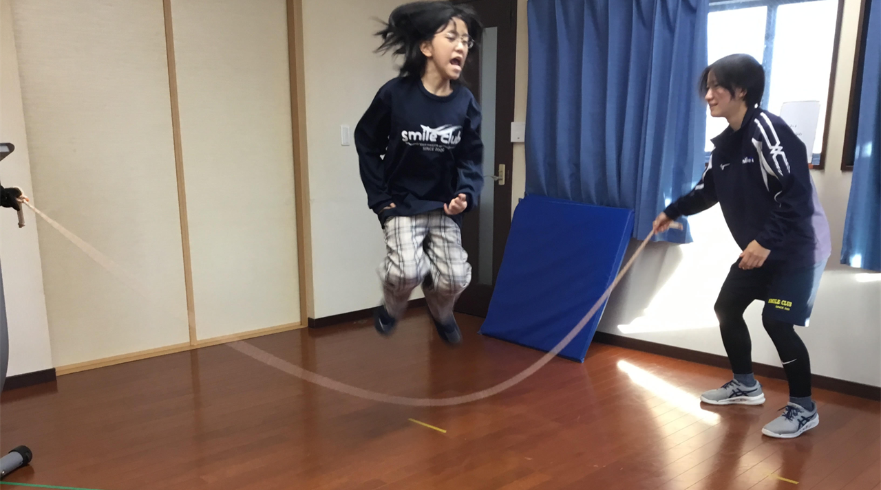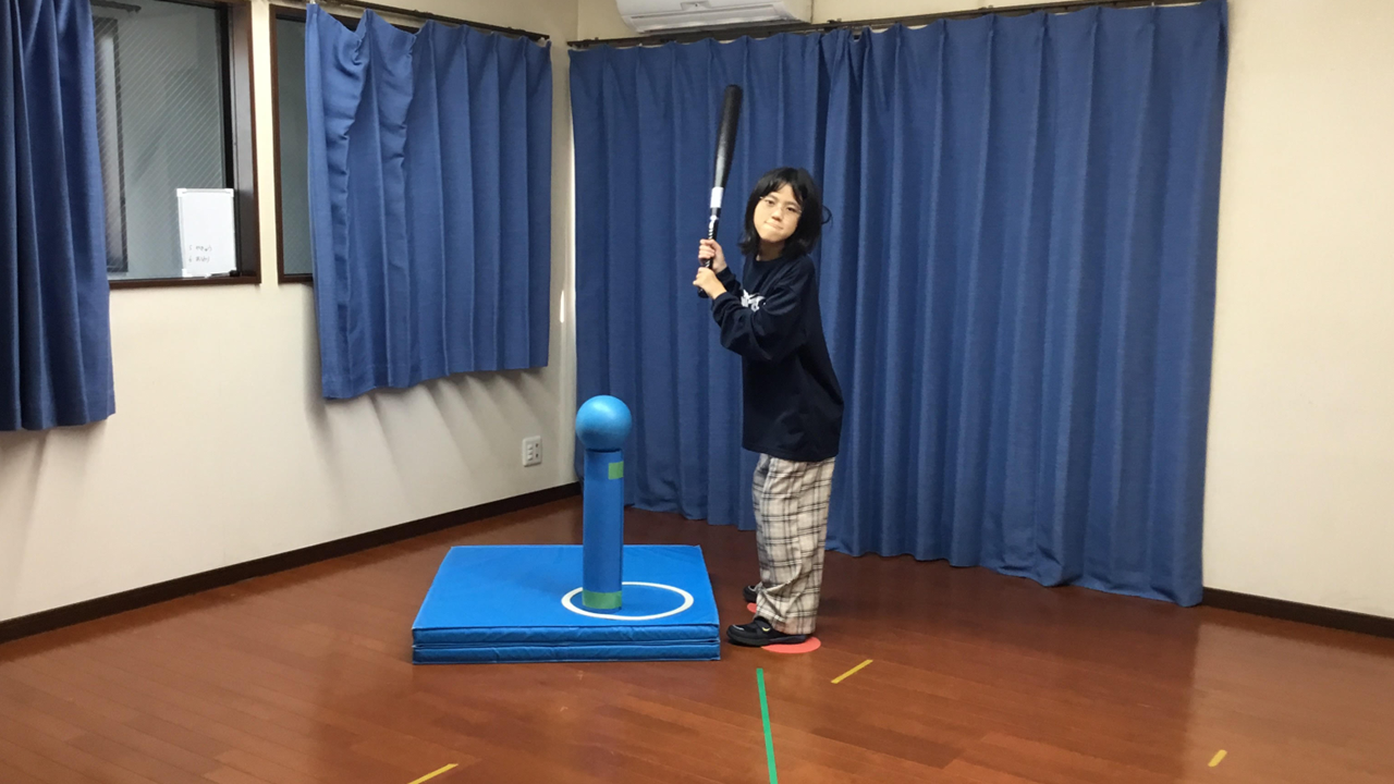 妹さんは長縄とバッティングに取り組んでいます。長縄では、最初は回っている縄への恐怖心があったため、へび跳びや波跳びから始めました。跳ぶことへの自信がつくと本人から回し跳びに挑戦してみたいと話してくれて、回し跳びも跳ぶことができました。バッティングでは、敵に見立てた的にめがけて打つことを楽しんでいます。以前に比べて体の回転を使って振ることができ、鋭い打球を飛ばせるようになりました。