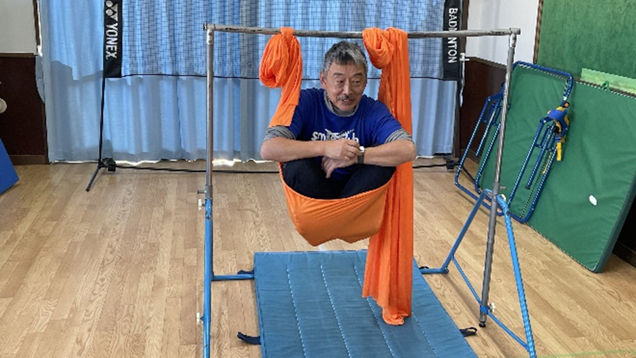 長谷川先生にはこれまでに2度研修をしていただき、遊びから運動へ繋がるようなたくさんのアイディアを教えていただきました。今回も新たにバランスボールを使った運動や、エアリアルヨガなどを教えていただき、スタッフも楽しく体験することができました。「これは子どもたちも好きそうだね」と、子どもたちが楽しく運動に取り組めるようにイメージしながら学ぶことができました。