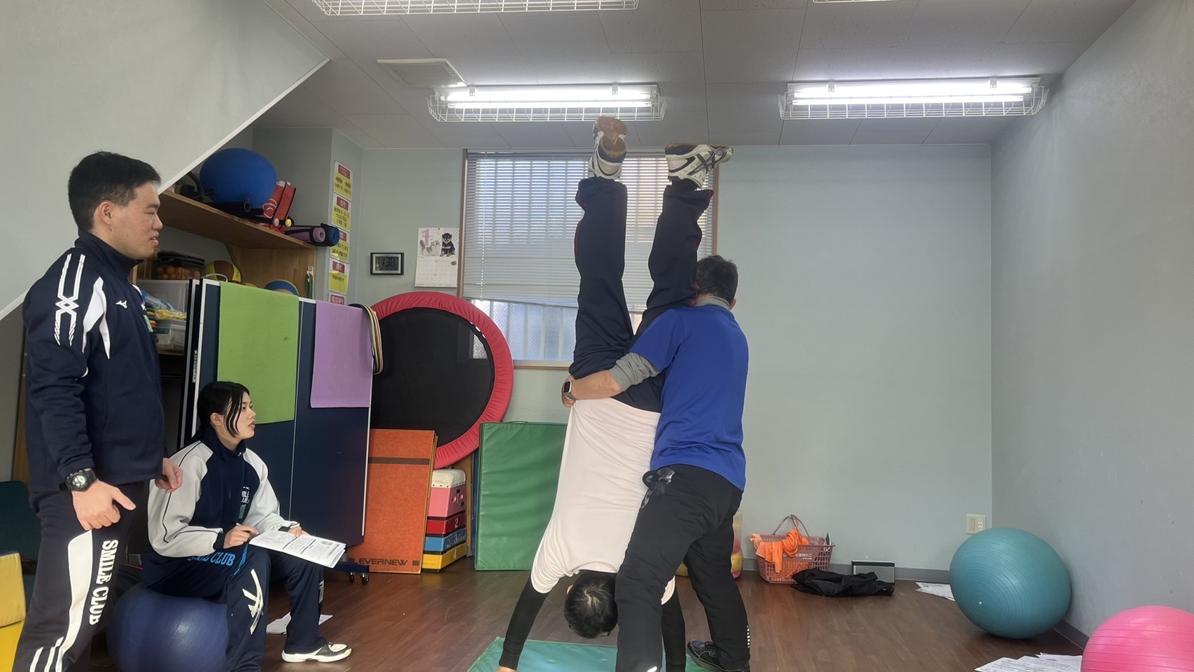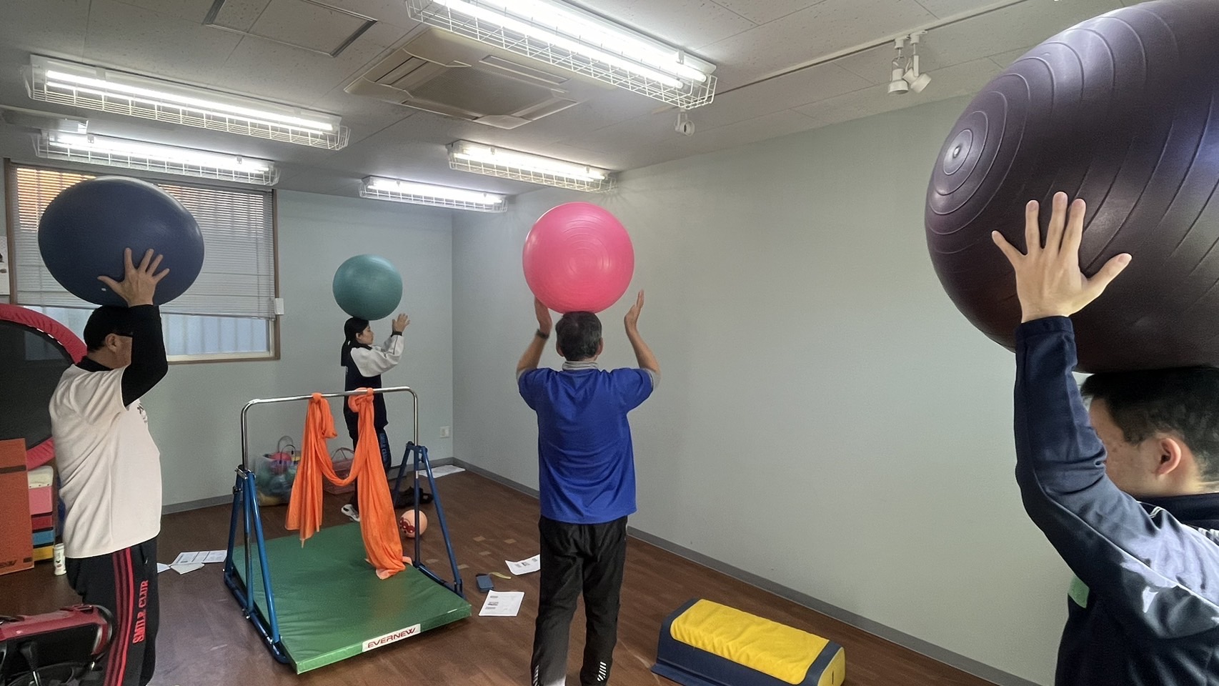 今回の研修では姿勢が悪くなってしまう児童に対しての姿勢改善のための運動や、足首の硬さを改善ずるストレッチ、またバランス感覚を鍛える運動や側転の際の補助のやり方についても教えていただきました。音楽を使いながらバランスボールなどの道具を使って楽しく能力が身につくような方法を教えていただき、実際にスタッフも身体を動かしながらやり方を学びました。