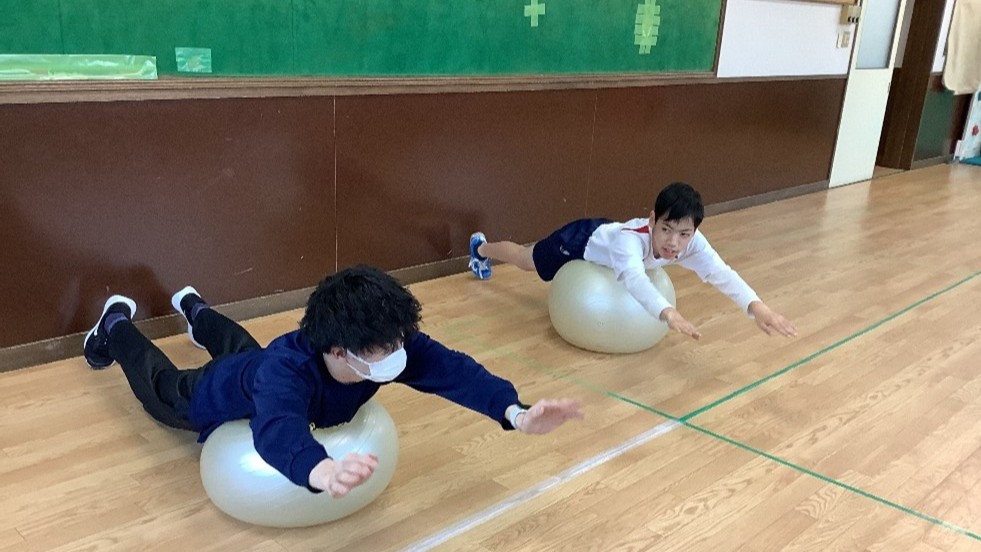 スマイル松戸岩瀬では腹筋や背筋などの筋力強化のために体幹バランスボールを使ってトレーニングをしています。また日常で重いものを持ち運びする力をつけられるように、水の入ったペットボトルの重りを持って、握力や腕の力をつけるトレーニングも行っています。