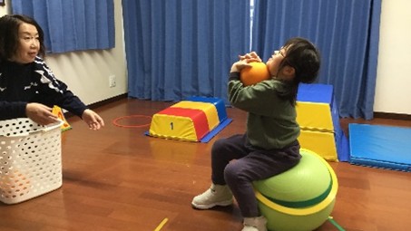 1年前はひと時も目を離せず補助の手を離したら転ぶのではないかとドキドキするほどでした。楽しみながら体を動かし、登る、降りる、止まる、踏ん張るがひとりでできるようになることを目標にしました。ミニハードルで足を上げたり、マットのトンネルをくぐったり何でも一生懸命取り組んでいました。今ではひとりで立ったまま風船バレーのラリーが何回続くかチャレンジしたり、鉄棒に取り組んだり目を見張る成長を見せてくれています。何よりもいつも笑顔で取り組む姿は私達スタッフに運動療育のやりがいを感じさせてくれます!