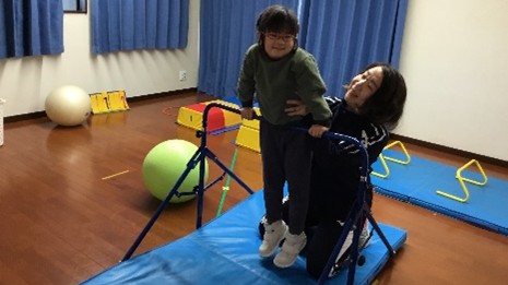 疾病による移動機能障害と失調症の年長です。教えて頂いている基礎となる身体の使い方が徐々に色々な運動に繋がり、先週より今週の方が凄くない⁉の連続です。通い始めた昨年は手引きだったのに、今では立って風船バレーができるようになりました。下手ですが、壁に寄りかからずやるだけで彼女にとっては凄い事。ジャンプすら大変だから、無理だと思っていた鉄棒のツバメ。そして縄跳び。たった一回だけど大きな一回。やらされているのではなく楽しんでるのが最高です!