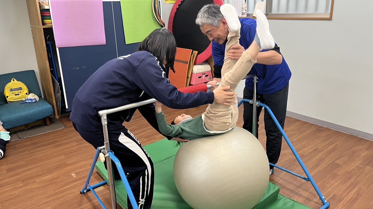 今回は実際にスマイル柏に通う児童にも参加していただき、主に鉄棒とバランスボールの指導について研修をしていただきました。
