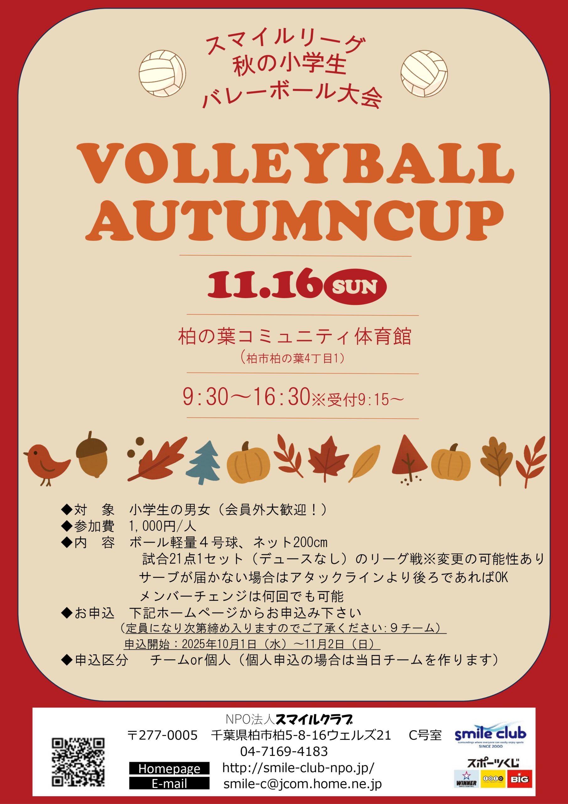 スマイルクラブではtoto助成を受けまして2025年11月16日(日)柏の葉コミュニティ体育館にて、小学生のバレーボール大会VOLLEYBALL AUTUMN CUPを開催いたします!