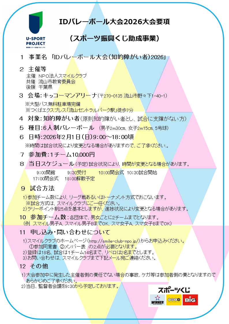 この度スマイルクラブ主催、流山市教育委員会共催、千葉県後援にてIDバレーボール大会2026(知的障がい者バレーボール大会)を2026年2月1日(日)キッコーマンアリーナ(流山市民総合体育館:地図)で下記チラシにて開催いたします。