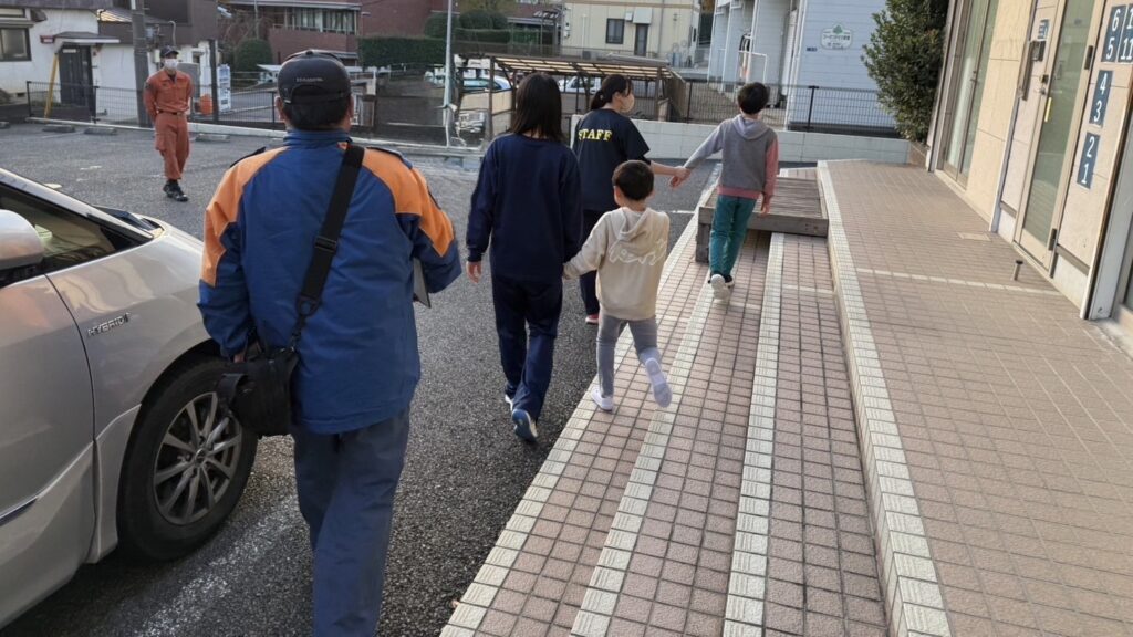 避難経路の確認をしたうえで、指導者と手をつないで安全に避難できるよう訓練を行っています。