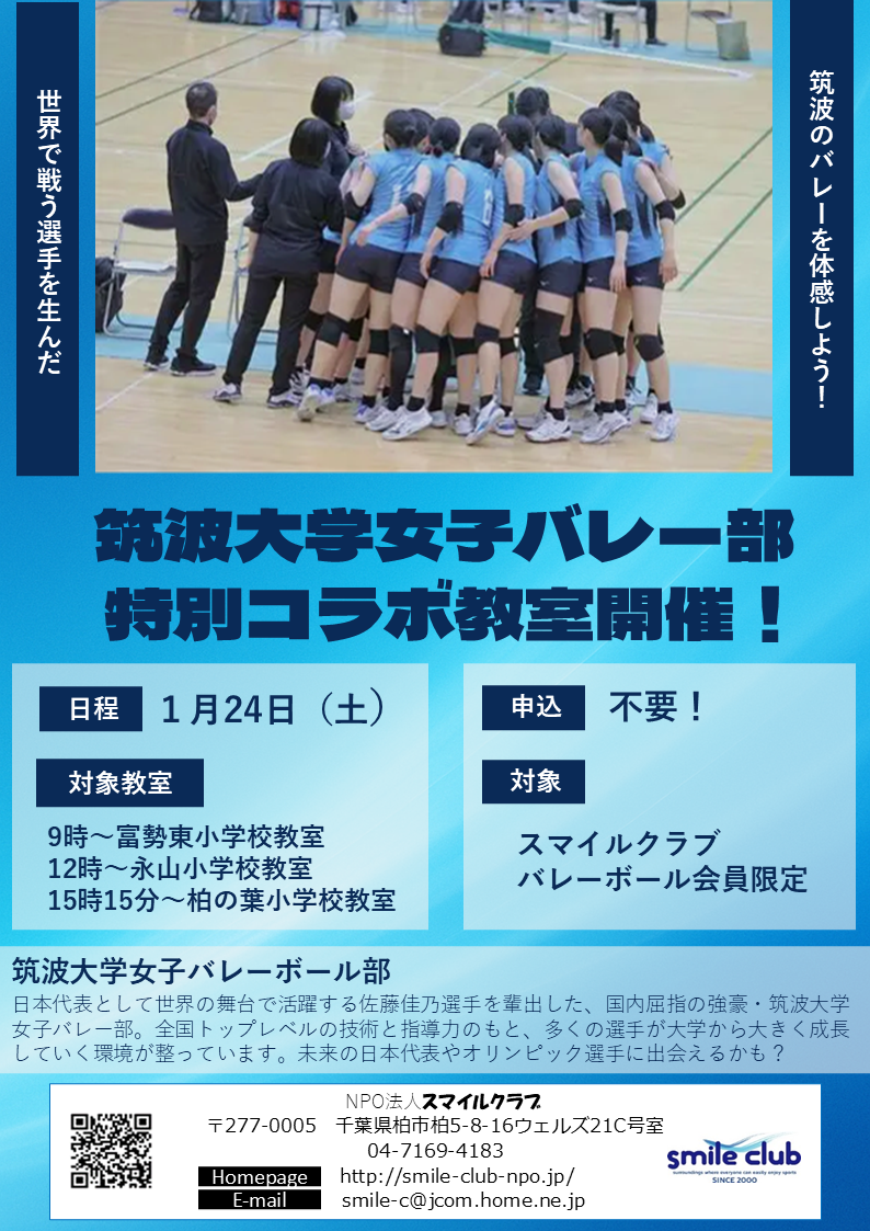 この度スマイルクラブでは筑波大学女子バレー部の皆さんをお招きし、特別コラボ教室を開催いたします。