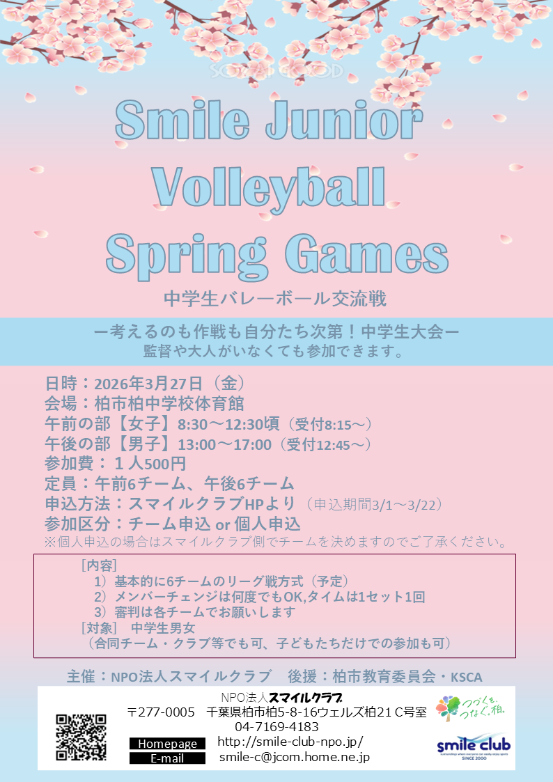 この度スマイルジュニアバレーボールスプリングゲームス(バレーボール中学生交流戦)を、主催スマイルクラブ・後援柏市教育委員会・KSCAのもと開催いたします!!