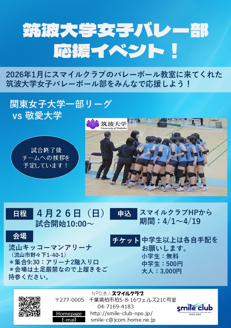 参加者募集NEWS&TOPICSバレーボール教室 関東女子大学一部リーグ「筑波大学女子バレー部」応援イベント開催! 参加者募集 2026.04.01 スマイルクラブでは、関東女子大学一部リーグに所属する筑波大学女子バレー部の応援イベントを開催します!今年1月の土曜日教室にお越しいただき、特別教室でバレーボールを教えてくださった選手たちの活躍を、みんなで一緒に応援しましょう! 応援イベントに参加希望の方は下記チラシをお読みになりこちらからお申込みください!!