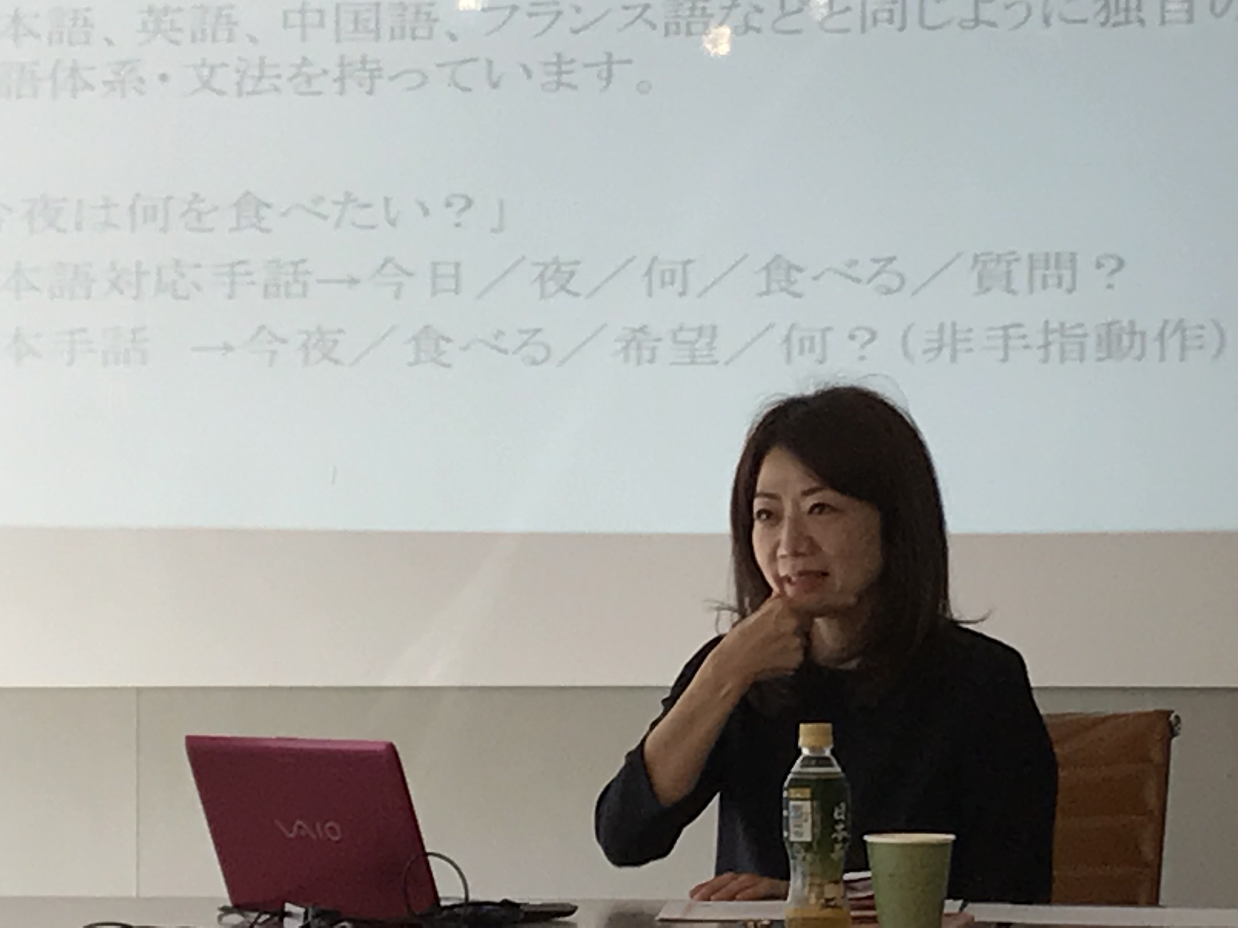 先ずは日本手話、日本語対応手話の違い、手話で聾者の方とコミュニケーションをとるうえでポイント等をお聞きしました。