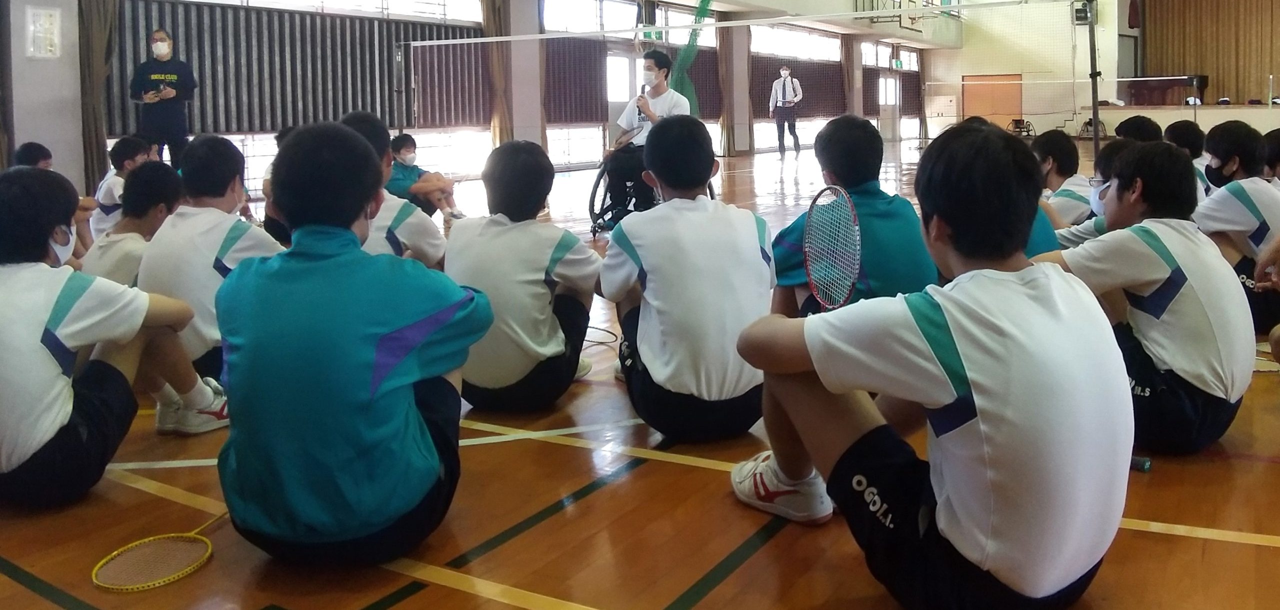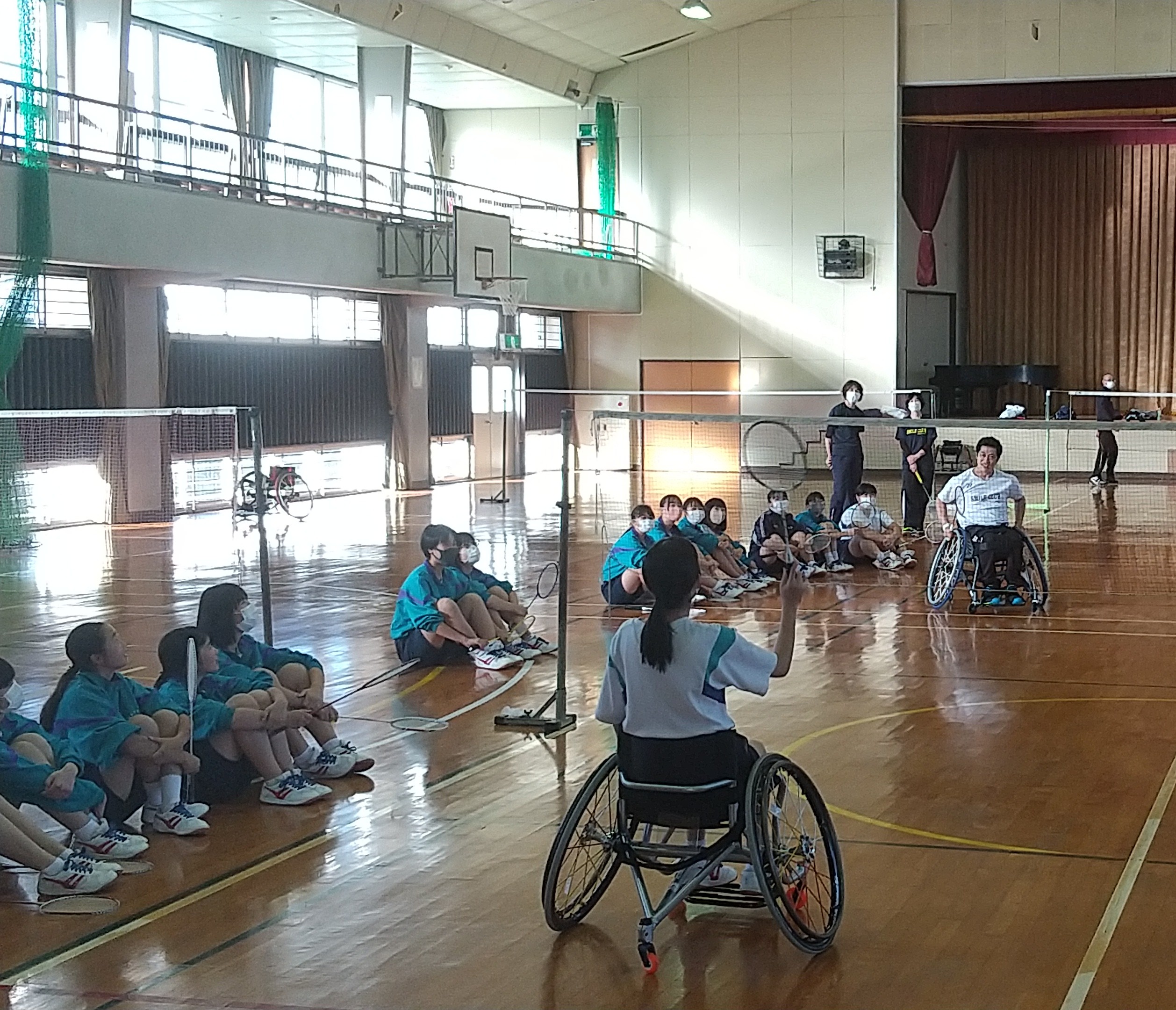 パラバドミントンについての説明や車椅子の操作方法を学んだ後、パラバドミントンの体験が行われました。生徒と大浜選手との試合では、ラリーが続く場面もあり会場も大いに盛り上がりました。
