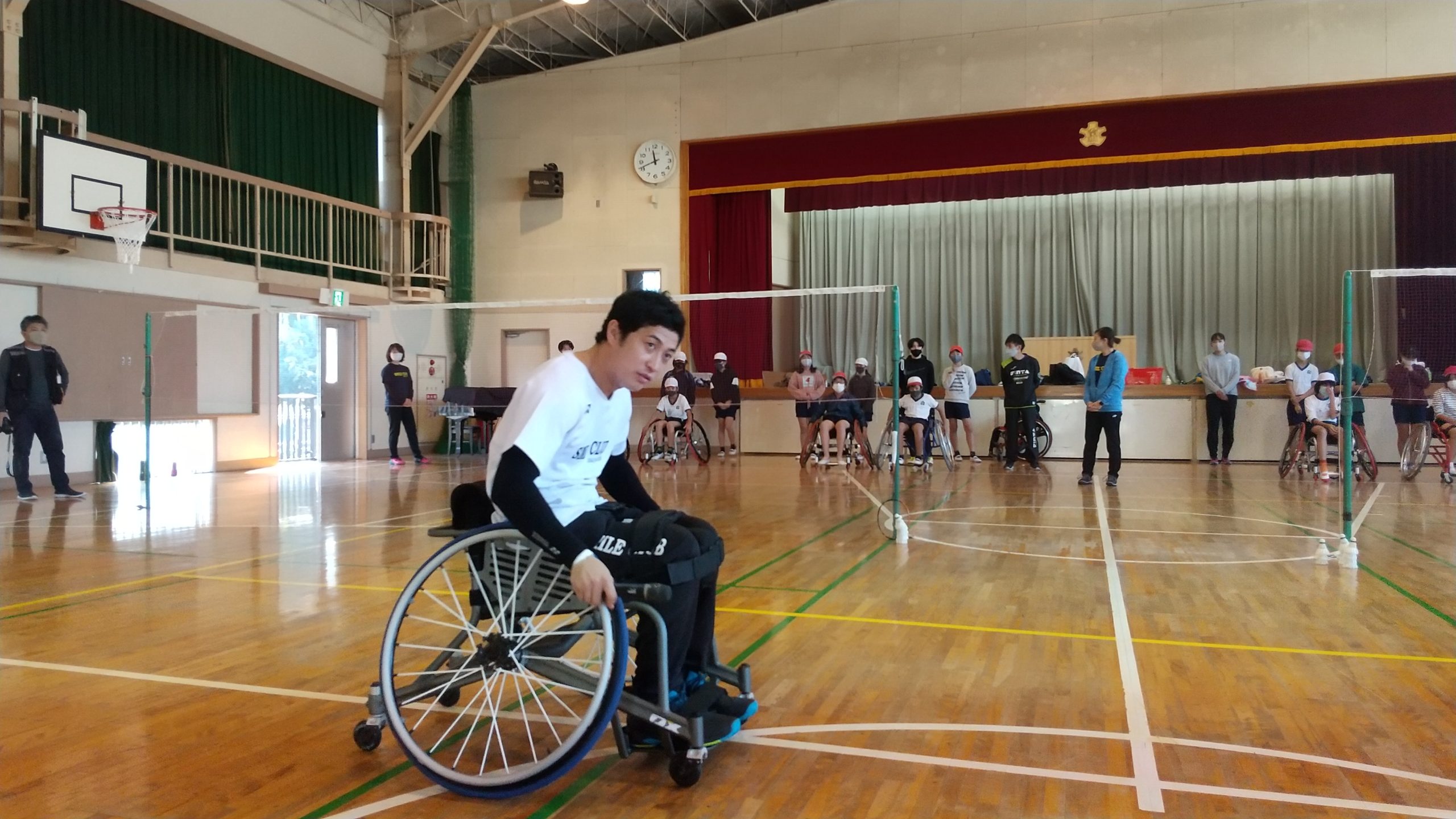 イベント報告スマイルパラアスリートNEWS&TOPICS研究・助成金事業等 柏市立土南部小学校 パラバドミントン出前授業(WAM助成事業)開催! イベント報告 2020.11.18 11月17日(火)に柏市立土南部小学校にて出前授業を行ないました。 講師はスマイルクラブ所属の大浜 真選手です! パラバドミントンについての説明や車いすの操作方法を学んだ後、パラバドミントンの体験が行われました。 最初は車いすの操作に戸惑っていた児童の皆さんも、回数を重ねるにつれて上手に操作できるようになり、大浜選手との試合も大いに盛り上がりました。 本日は流通経済大学のみなさんがアシスタントとして来てくださいました! 車いすの操作について説明する大浜選手 流通経済大学の大学生のみなさん
