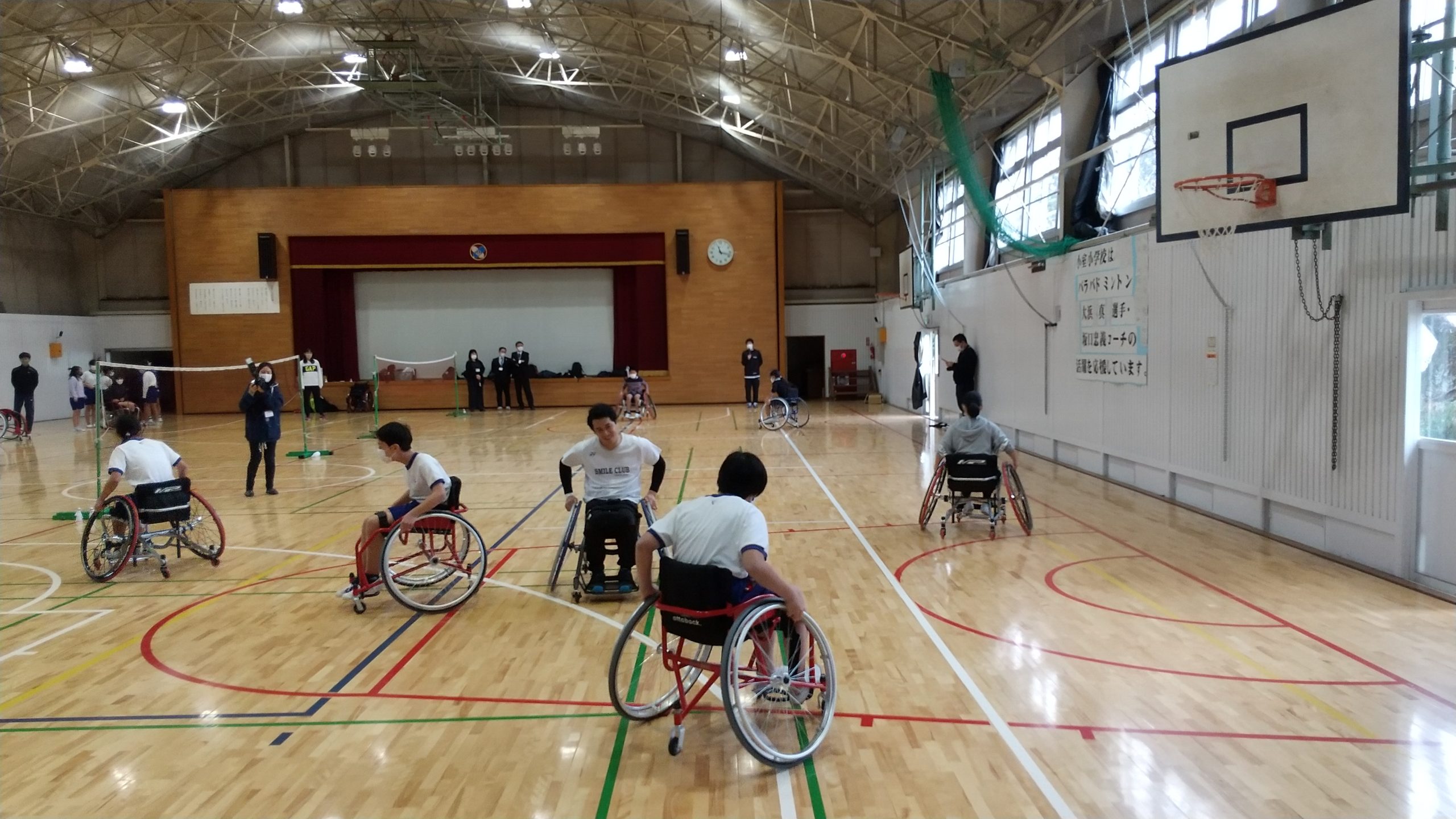 11月25日(水)船橋市立小室小学校にて、大浜真選手(スマイルクラブ所属)・坂口忠義コーチによるパラバドミントンの出前授業を行ないました。体育館に入ると児童たちが作成してくれた大浜選手と坂口コーチへの応援メッセージ入りの横断幕がお出迎えしてくださいました。