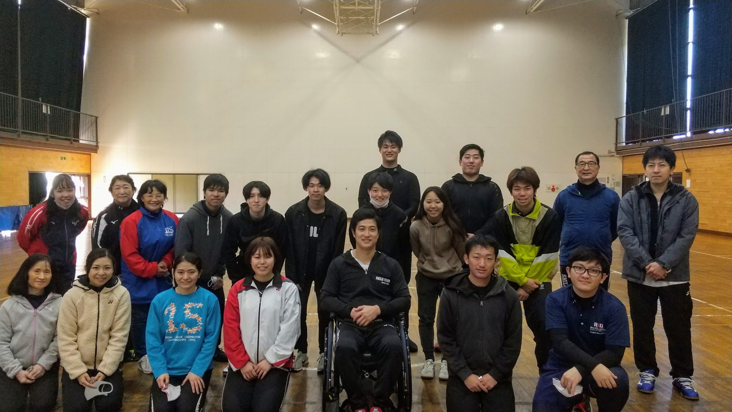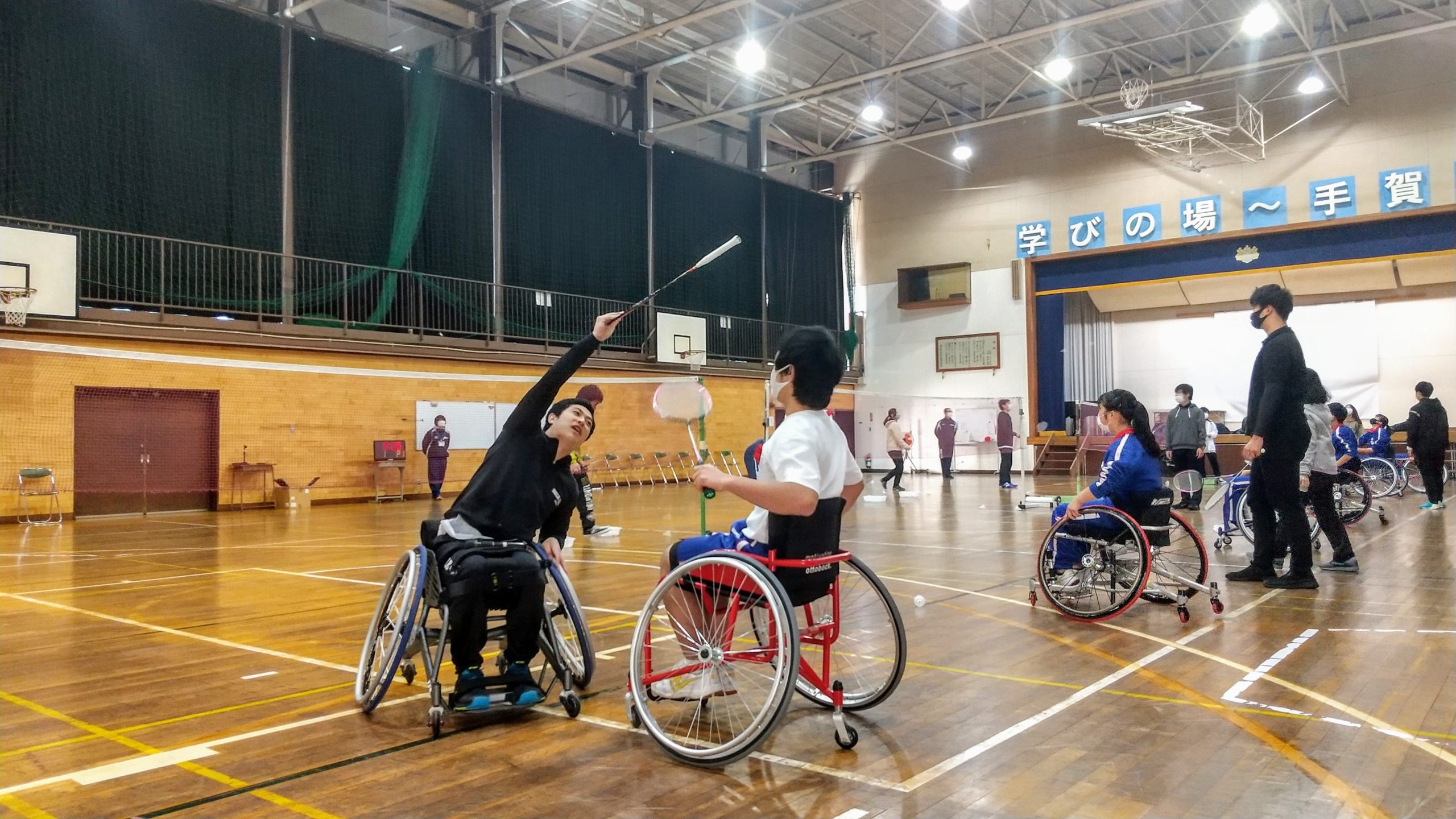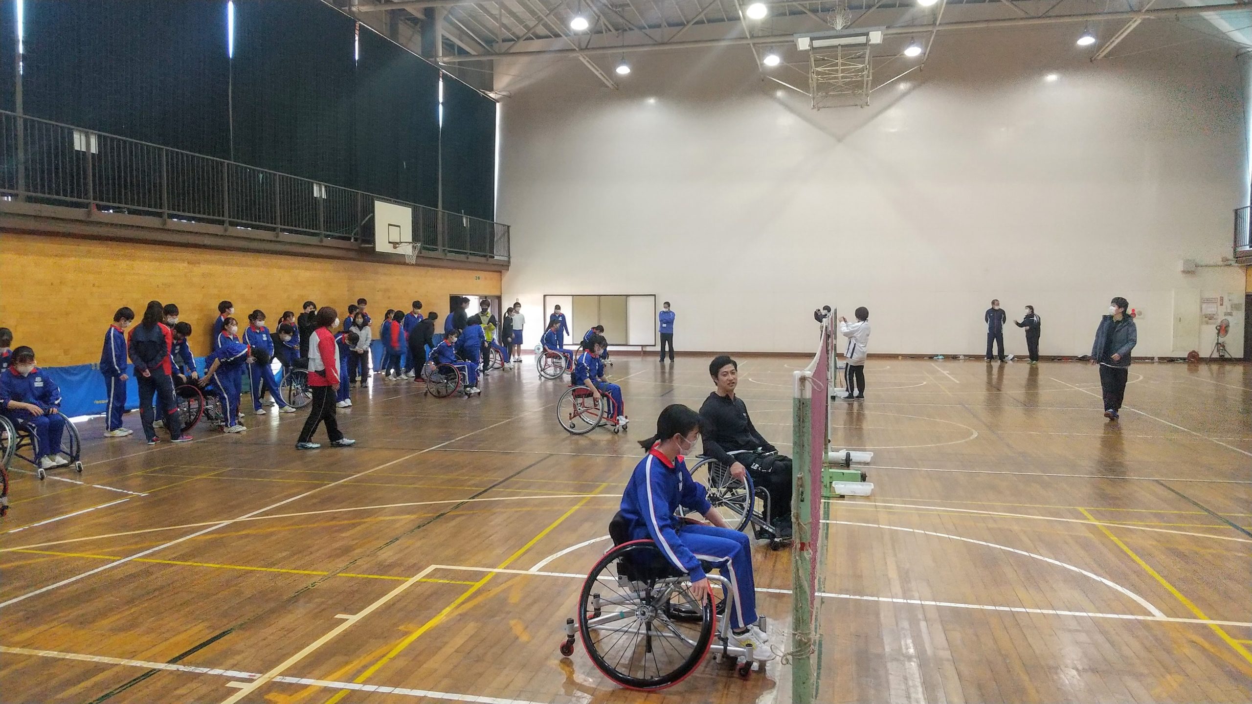 イベント報告スマイルパラアスリートNEWS&TOPICS研究・助成金事業等 柏市立手賀中学校 パラバドミントン出前授業(WAM助成事業)開催! イベント報告 2020.12.01 11月30日(月)柏市立手賀中学校にて大浜真選手(スマイルクラブ所属)を講師にパラバドミントン出前授業が実施されました! 全校生徒が車いす操作、パラバドミントンを体験!授業終了後も大浜真選手を囲んで質問が続くなど、盛況のうちに終了いたしました。 本日も千葉大学・流通経済大学・スポーツ推進委員の方々など沢山のボランティア参加いただきました。ありがとうございました! 車いす操作を練習中! パラバドミントン体験! ボランティア参加いただいたみなさんと
